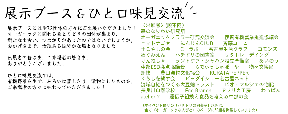 出展者は有機農業の実践者やオーガニックフラワー・オーガニックコットンやフェアトレードコーヒーなどの加工品を取り扱う団体、そして生産者と消費者を結ぶ有機宅配の団体など、さらに地域で自然や生き物と触れ合うイベントを実施する団体や持続可能な社会に向けての取組みを行う団体など、多様で多彩な方々が集まりました。