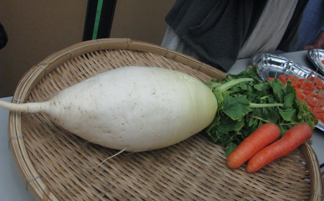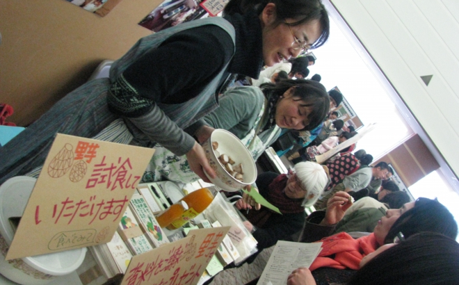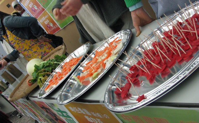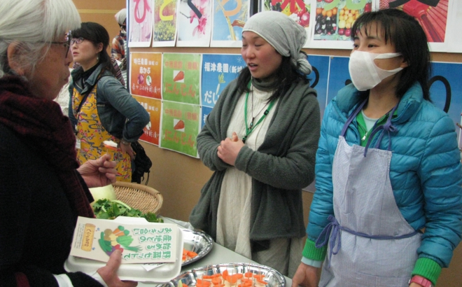またひと口味見交流は12時から13時半まで同会場で行われ、有機農産物そのままの味わいを体験していただくべく、煮たり蒸したりしただけの簡単な調理を施した農産物を提供しました。
